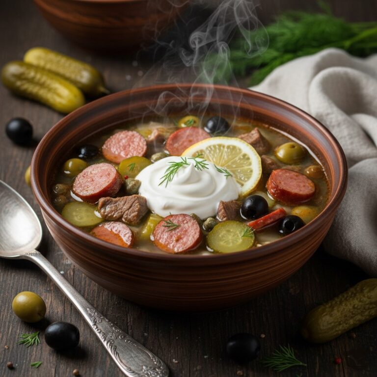 Solyanka is a hearty, sour, and spicy Russian soup, known for its rich flavors and variety of ingredients, especially cured meats, pickles, and olives. It's perfect for a cold day!
